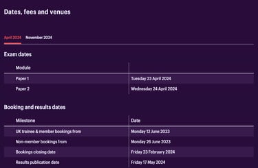 Timing: These exams happen two times a year – April and November. There are several important dates when bookings open and close. Take a look at this image from the RCR website. Plan well in advance so that life doesn’t get in the way.